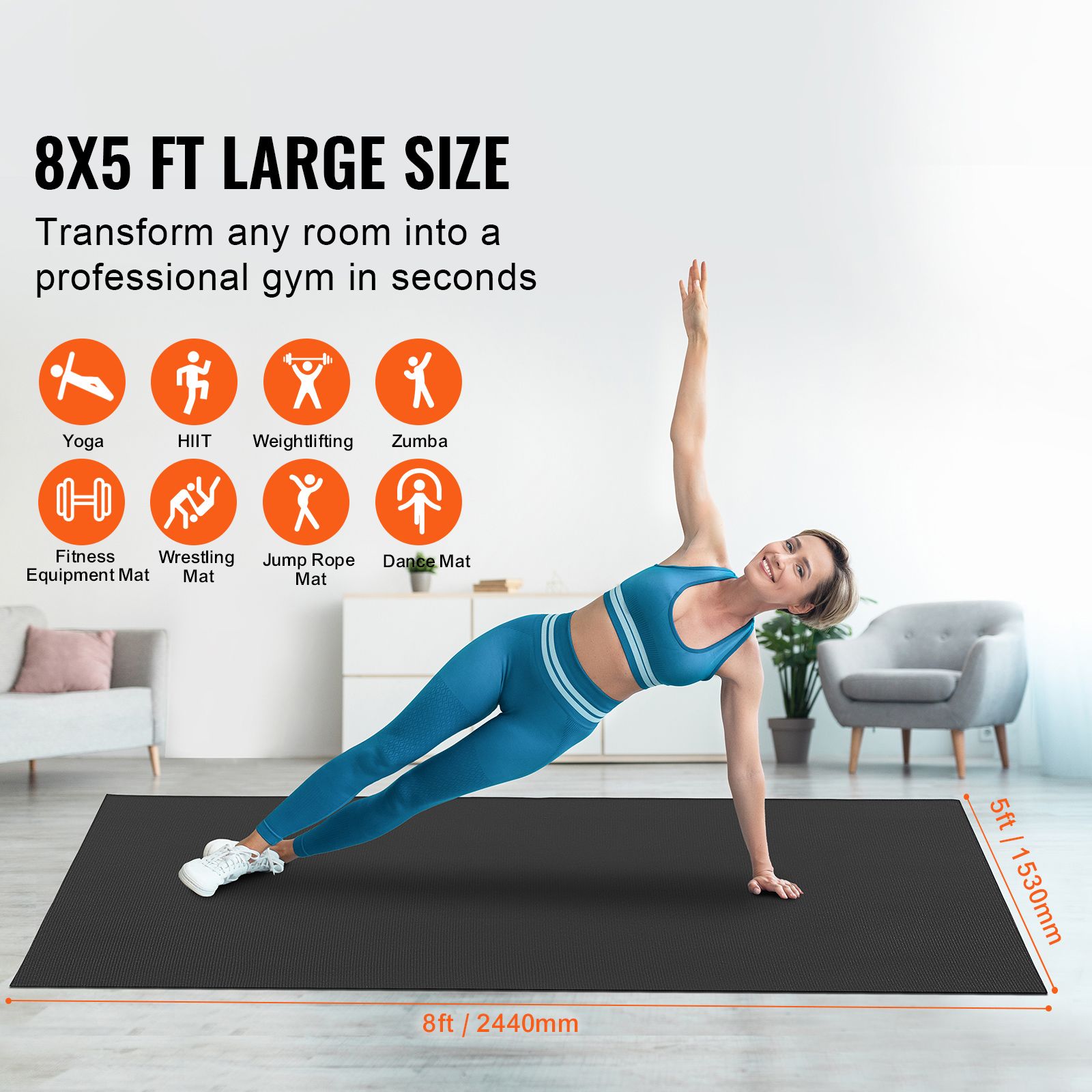 1.Professional Home Gym: The exercise mat features a large 8x5ft design, suitable for 1-2 people. Simply unroll and spread out the mat to turn any room in your home into a professional home gym. You can perform yoga, HIIT, aerobics, dance workouts, including P90x, Insanity, T25, Zumba, TRX, kettlebell exercises, jump rope, and various other exercises.