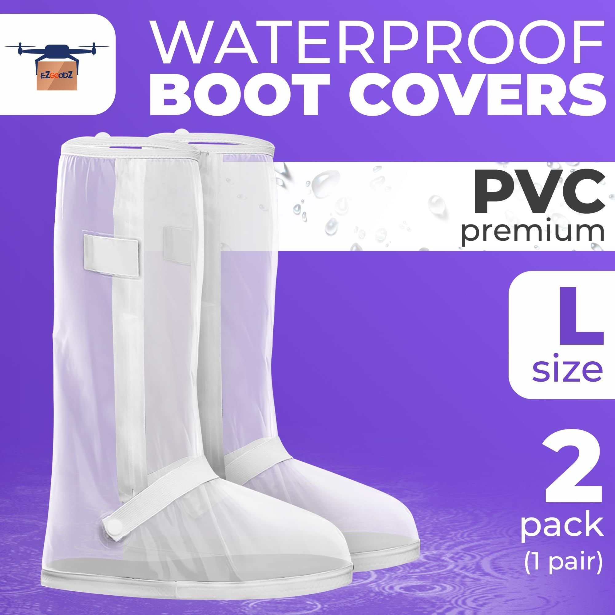 1.2 pairs of large clear rain shoe covers. Comfortable waterproof shoe cover with snap button on top, zipper on side, and elastic straps is easy to put on and take off. The walking boot cover fits any average adult feet and keeps them dry and boots safe. Length: 11.4 inches. Height: 15.4 inches.