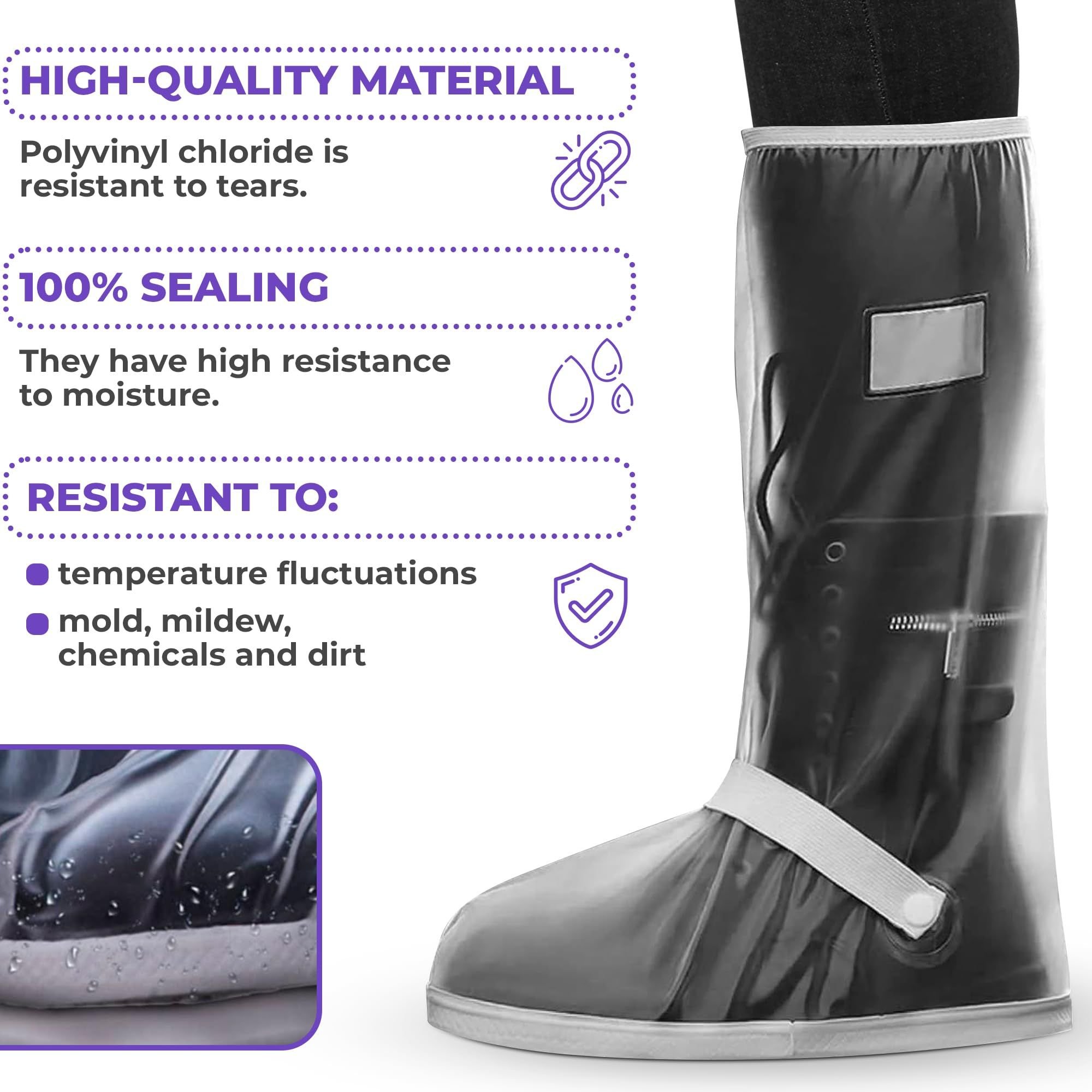 2.Reusable boot covers. Waterproof shoe covers for men / women are made of durable PVC (polyvinyl chloride) and are reusable. Shoe protector covers are ideal for long protection, even on cold days, from water, dirt, and oil. Quality of shoes cover ensures reusability!